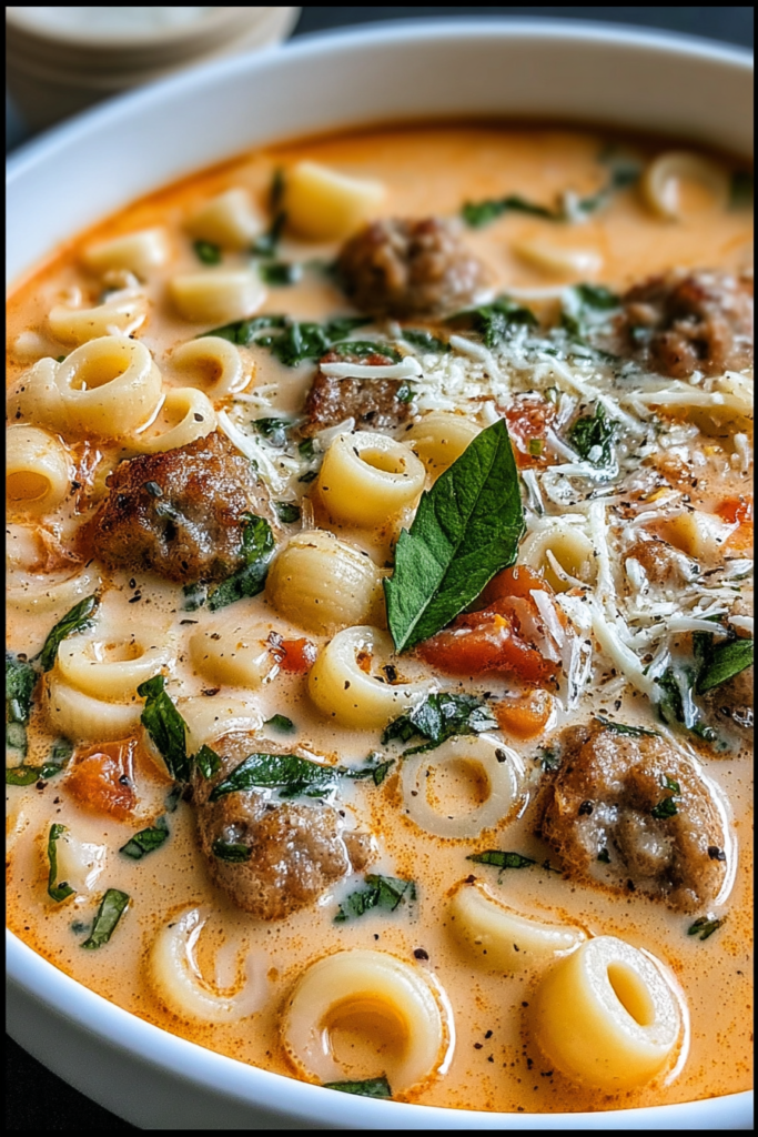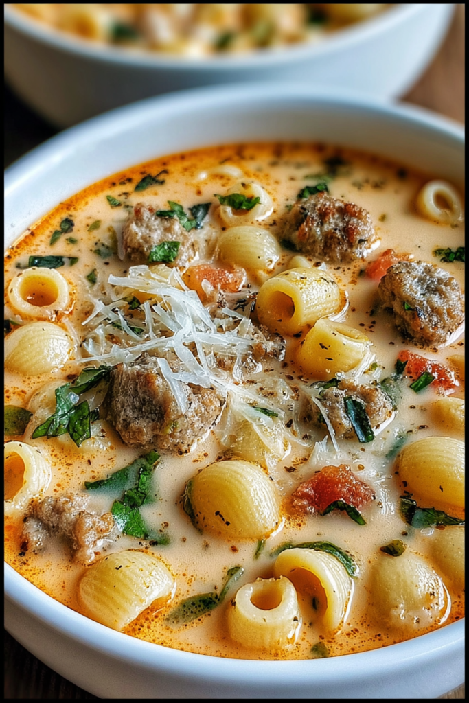 Creamy Parmesan Italian Sausage Ditalini Soup represents the perfect intersection of comfort, convenience, and sophistication—proving that restaurant-quality Italian flavors can emerge from your own kitchen with minimal time investment and straightforward techniques. This recipe demonstrates that impressive cooking doesn’t always require lengthy ingredient lists or complicated procedures; sometimes the most memorable dishes come from intelligently combining simple elements and allowing them to work together harmoniously. The one-pot method means you can produce this elegant soup even on hectic weeknights when doing dishes feels like an insurmountable task, while the 30-minute timeline ensures dinner can happen even when you’re starting from scratch at 6 PM. While the calorie count of 480-520 per serving is substantial, this is genuinely a complete meal that requires nothing more than bread and perhaps a simple salad to feel satisfying and balanced—the combination of protein, carbohydrates, and vegetables (if using spinach) creates a nutritionally complete plate in a single bowl. For those watching calories, you can reduce each serving to approximately 350-400 calories by using turkey Italian sausage, substituting half-and-half for heavy cream, using less pasta and more vegetables, and reducing the Parmesan—all while maintaining the essential creamy, comforting character that defines this soup. The customizable nature means you can adjust spice levels, add or omit vegetables, vary the pasta shape, or even make it low-carb, ensuring this recipe adapts to your family’s preferences and dietary needs rather than requiring you to adapt to it. Whether you’re seeking a quick weeknight dinner, a warming winter meal, an impressive but easy dish for casual entertaining, or simply craving that particular comfort that only creamy soup can provide, this Creamy Parmesan Italian Sausage Ditalini Soup delivers on every promise—proving once again that some of the best recipes are those that make both the cooking and the eating equally rewarding, nourishing both body and soul with minimal fuss and maximum flavor.