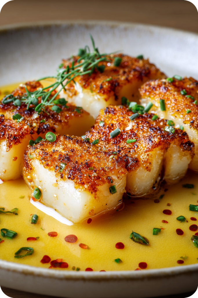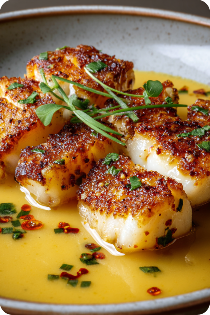 • Immediate Serving Recommended – Cod is best enjoyed immediately after cooking while the exterior remains slightly crisp and the butter sauce is hot and liquid; delaying service causes the fish to lose texture and the sauce to congeal.