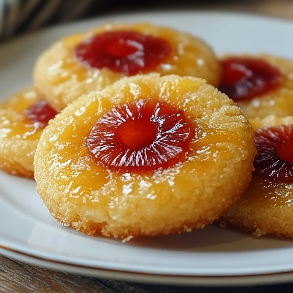 Pineapple Upside Down Sugar Cookies are a playful reinterpretation of the classic cake, transforming its caramelized fruit topping into individual handheld treats. Each cookie features a buttery sugar cookie base crowned with sweet pineapple, brown sugar, and a bright maraschino cherry. The result is a tender, golden cookie with a glossy, caramelized fruit top and nostalgic flavor in every bite.
