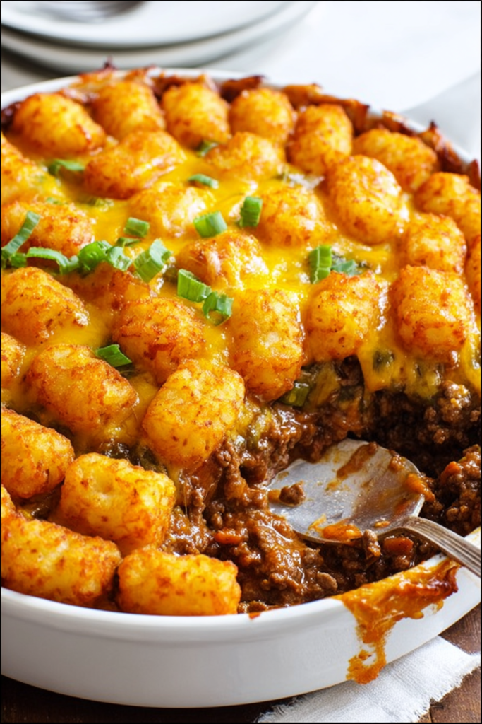 Tater Tot Sloppy Joe Skillet represents the creative evolution of American comfort food, honoring nostalgic classics while adapting them into modern convenience formats that fit contemporary lifestyles. This recipe appeals particularly to busy parents seeking quick, reliable meals that children actually eat without complaint, anyone craving the emotional warmth of retro American comfort food, or cooks wanting impressive-looking dishes that belie their simple preparation. The fusion approach—combining two beloved dishes into one—demonstrates how culinary creativity doesn’t require exotic ingredients or complicated techniques, just thoughtful pairing of complementary elements that create something greater than individual parts. The skillet-to-table presentation eliminates formal plating while the golden, cheesy appearance creates visual excitement that makes casual dinners feel special. The 30-minute timeline removes the common excuse of insufficient time, proving that homemade meals can compete with takeout convenience while delivering superior taste, nutrition, and satisfaction. While the 450-calorie estimate per serving represents hearty nourishment, the complete meal nature (protein, starch, dairy, vegetables from onions and tomato sauce) means no additional components are required, and the portions naturally satisfy without excessive consumption. For those seeking lighter versions, consider using ground turkey, baking tater tots instead of using frozen pre-fried varieties, reducing cheese to 1/2 cup, or adding significant vegetables like bell peppers and carrots to increase volume while decreasing caloric density; though these modifications will alter the indulgent comfort food character that defines this dish’s appeal. Ultimately, this recipe deserves permanent status in weeknight dinner rotations as proof that satisfying, delicious, family-approved meals needn’t require extensive time, complicated techniques, or gourmet ingredients—sometimes the best cooking comes from understanding what people love, combining those elements thoughtfully, and serving with the confidence that clean plates and requests for seconds are the greatest compliments any cook can receive.